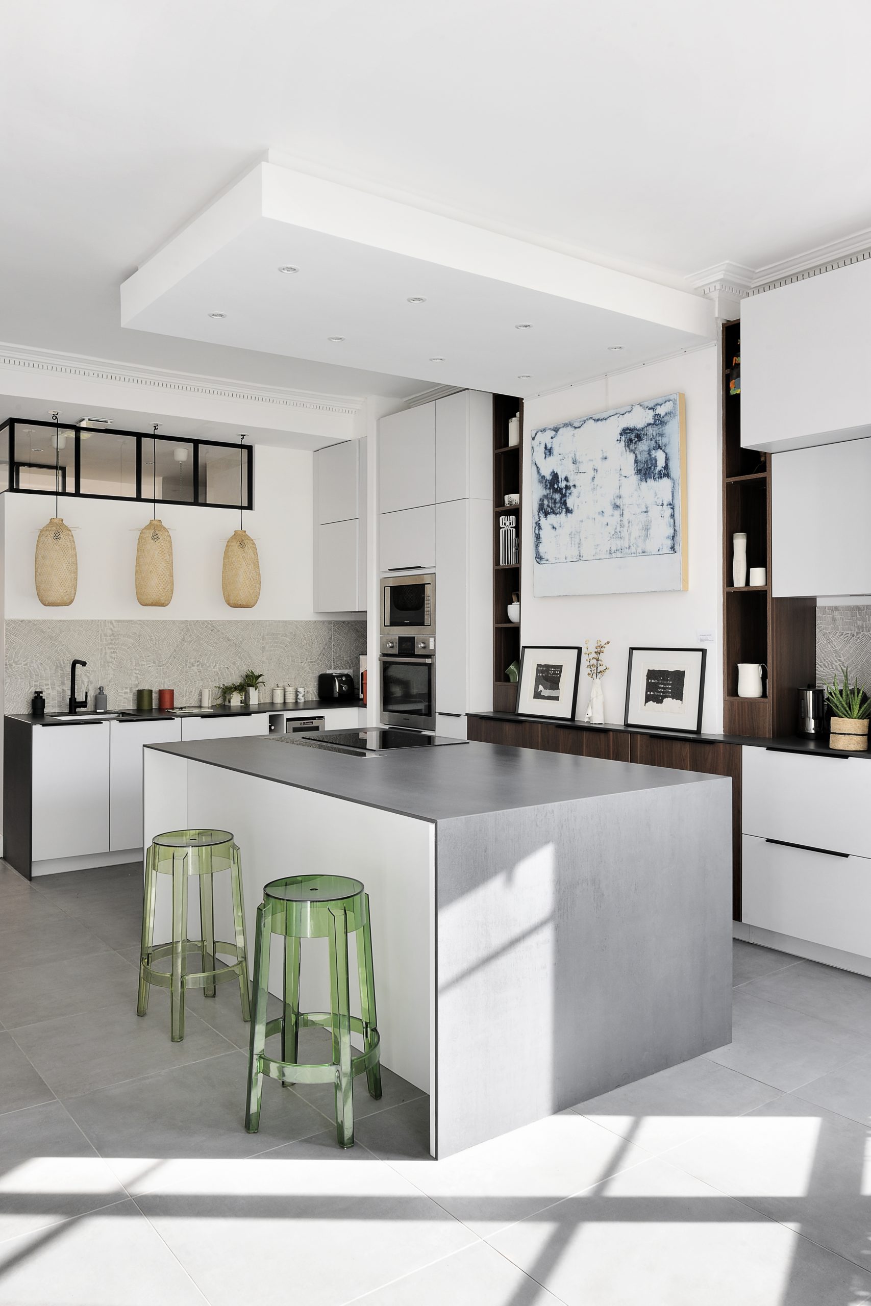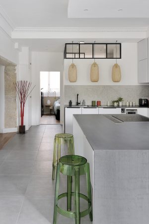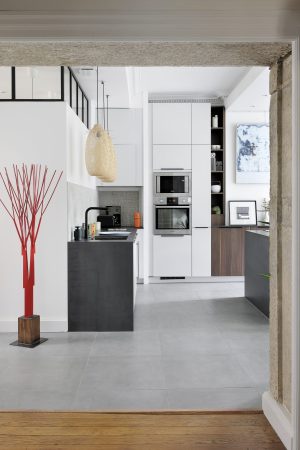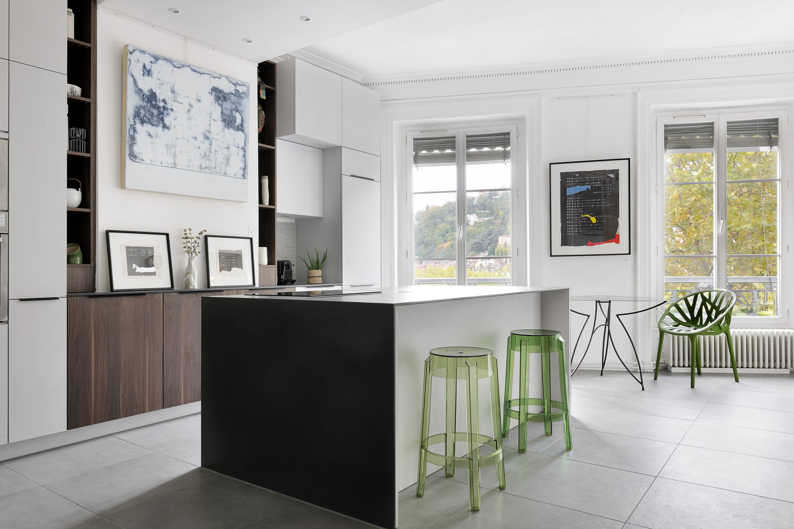 Appartement situé au coeur de la presqu’île, dans un immeuble 17ème, au bord de la Saône. Les propriétaires voulaient inverser la cuisine, la chambre et le séjour afin de créer une pièce conviviale où la cuisine s’effaçait pour laisser place à une grande pièce d’apparat et de réception. Ce lieu devait aussi remplir la fonction d’extension de la galerie d’art (le Racontart), située au rez de chaussée de l’immeuble et propriété du maître d’ouvrage.