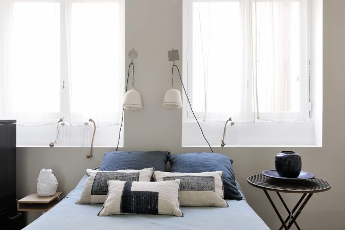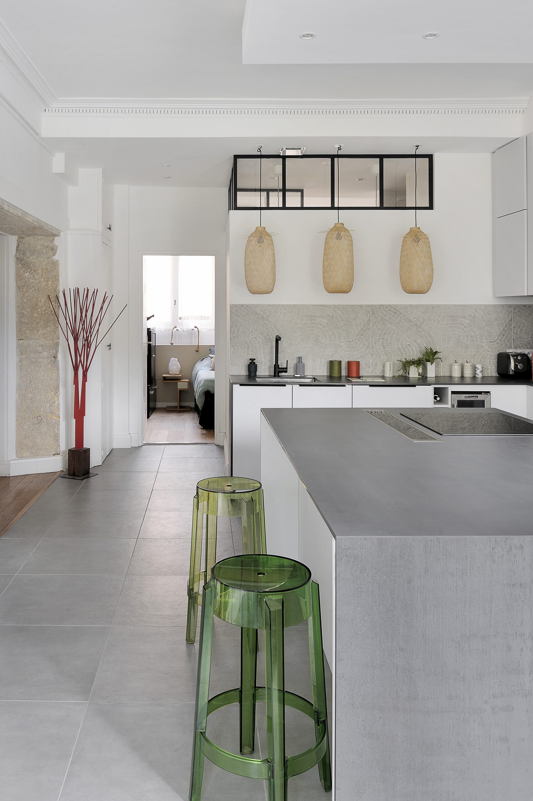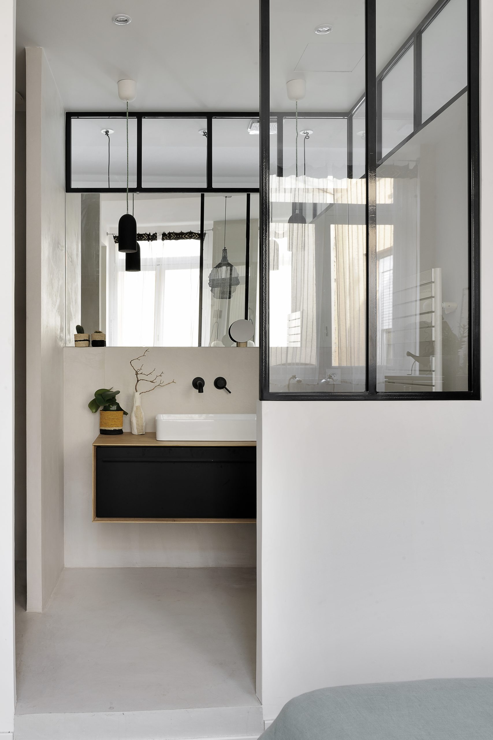 Cette pièce est complètement ouverte sur la chambre et permet par ses verrières hautes d’amener la lumière naturelle traversante jusqu’à la cuisine.