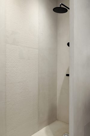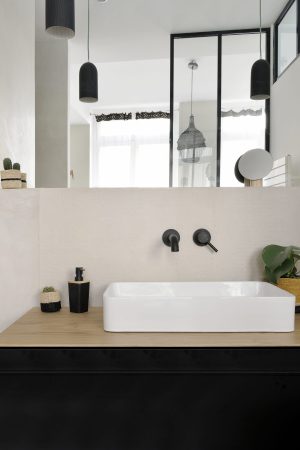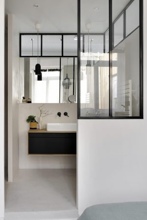 Pour des raisons techniques l’emplacement de la SDB a été conservée mais un plancher technique a été créé afin de le désolidariser de la dalle existante et avoir plus de flexibilité pour la création d’un nouveau réseau.